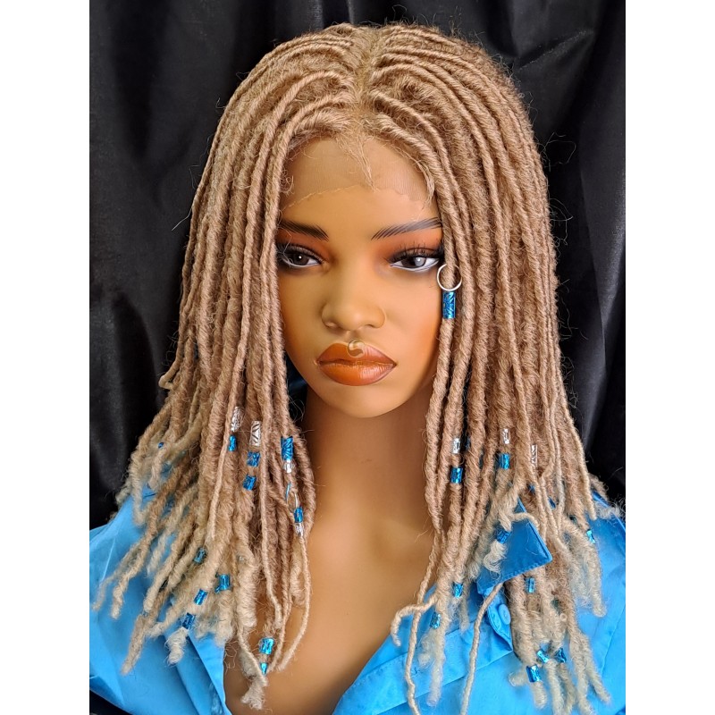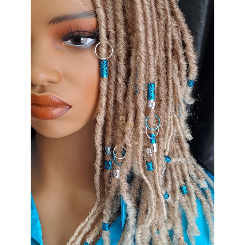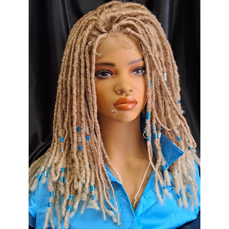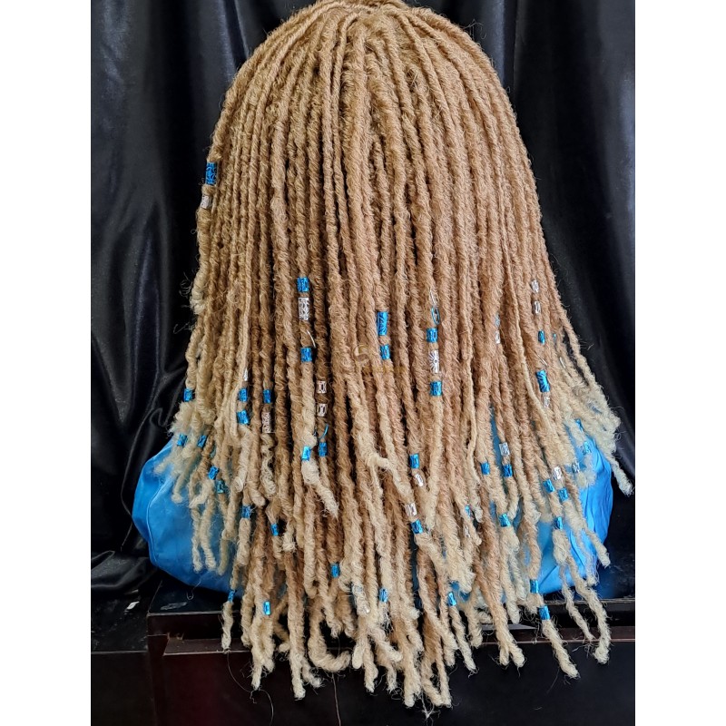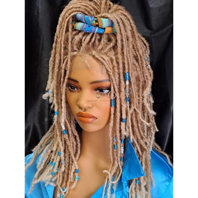 Peluca Dreadlocks realizada en cabello mixto, sintético y natural, tonalidad rubio medio en la parte superior y matización de color rubio extra claro en degradación hacia la zona inferior, complementado con adornos opcionales en azul y plata, y turbante tribal en tonos azules, con alambre interno, para crear tus propios looks veraniegos con un estilo único.