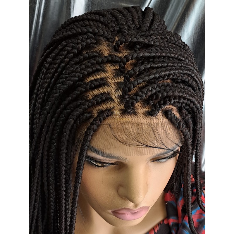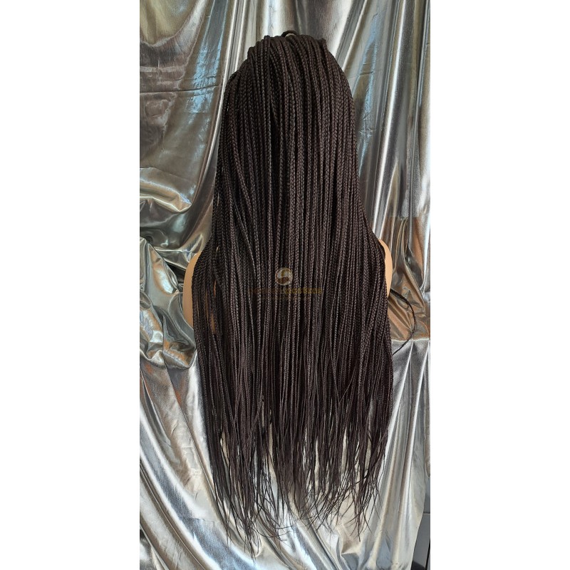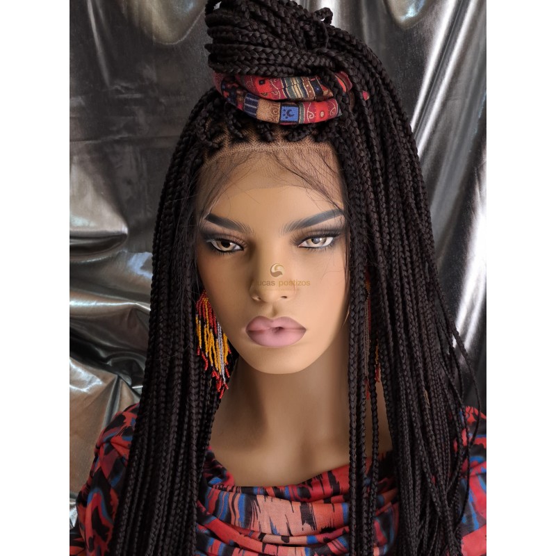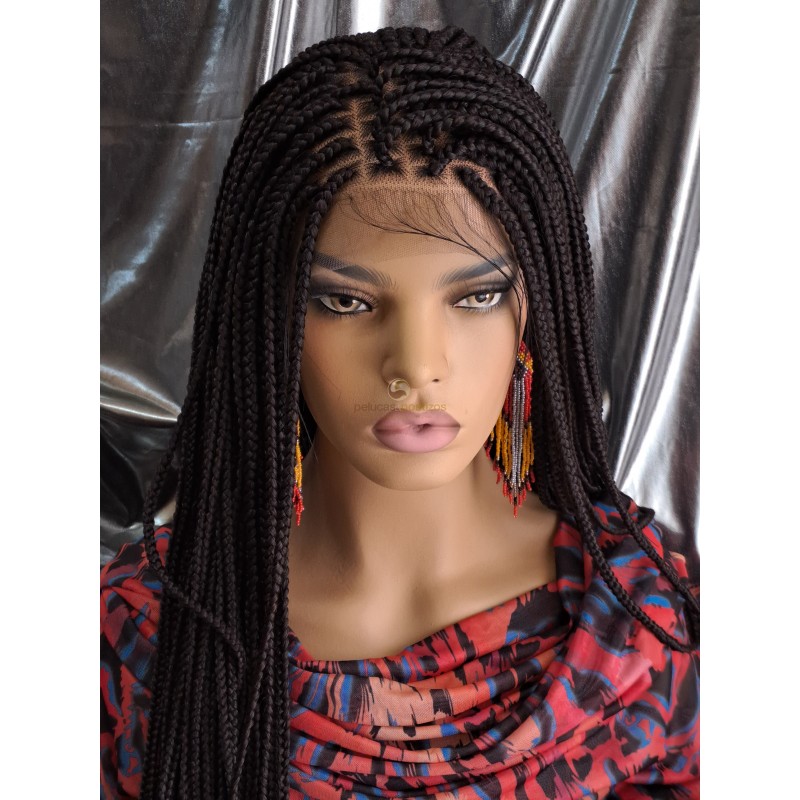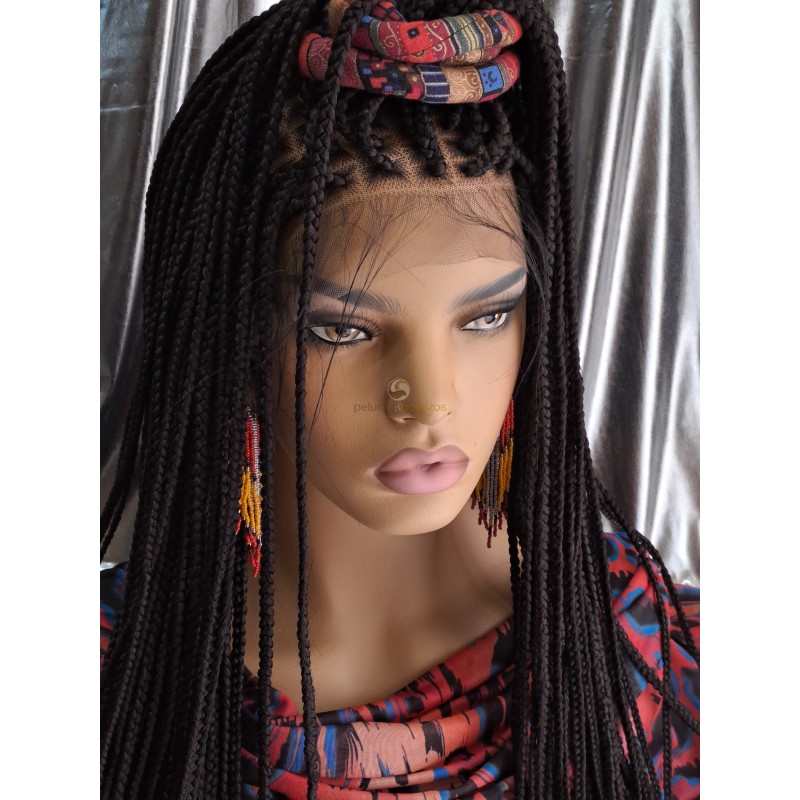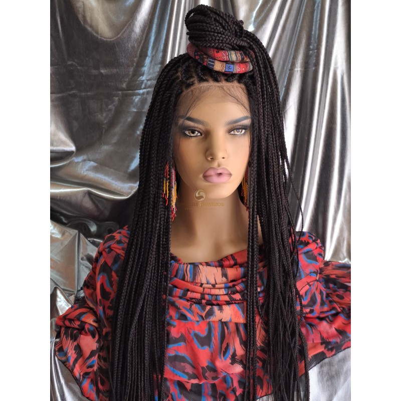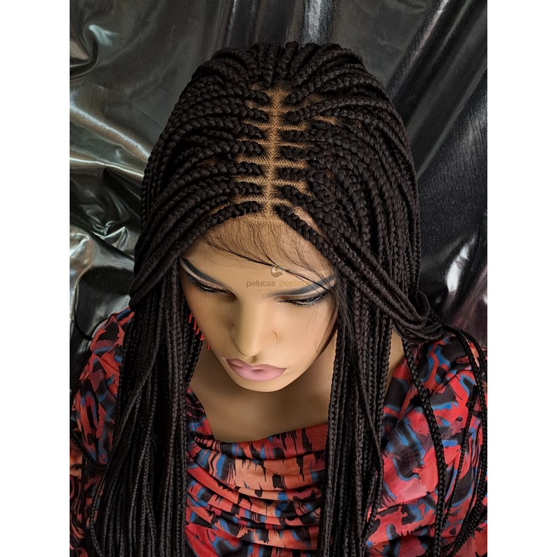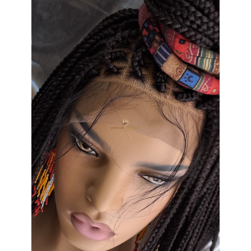 Exótica peluca de trencitas africanas, confeccionada en Sudáfrica de forma totalmente artesanal, y frontal con sutiles mechones de cabello para realizar baby hairs, dando un mayor aspecto de naturalidad.